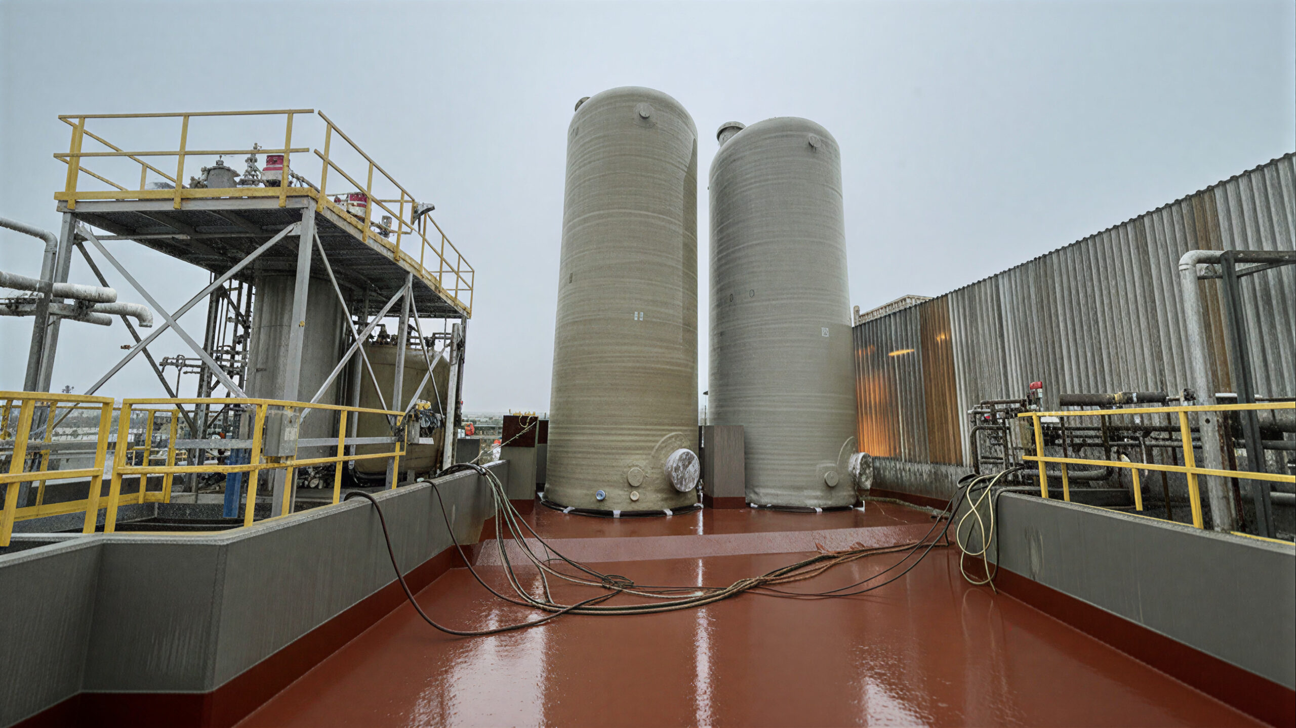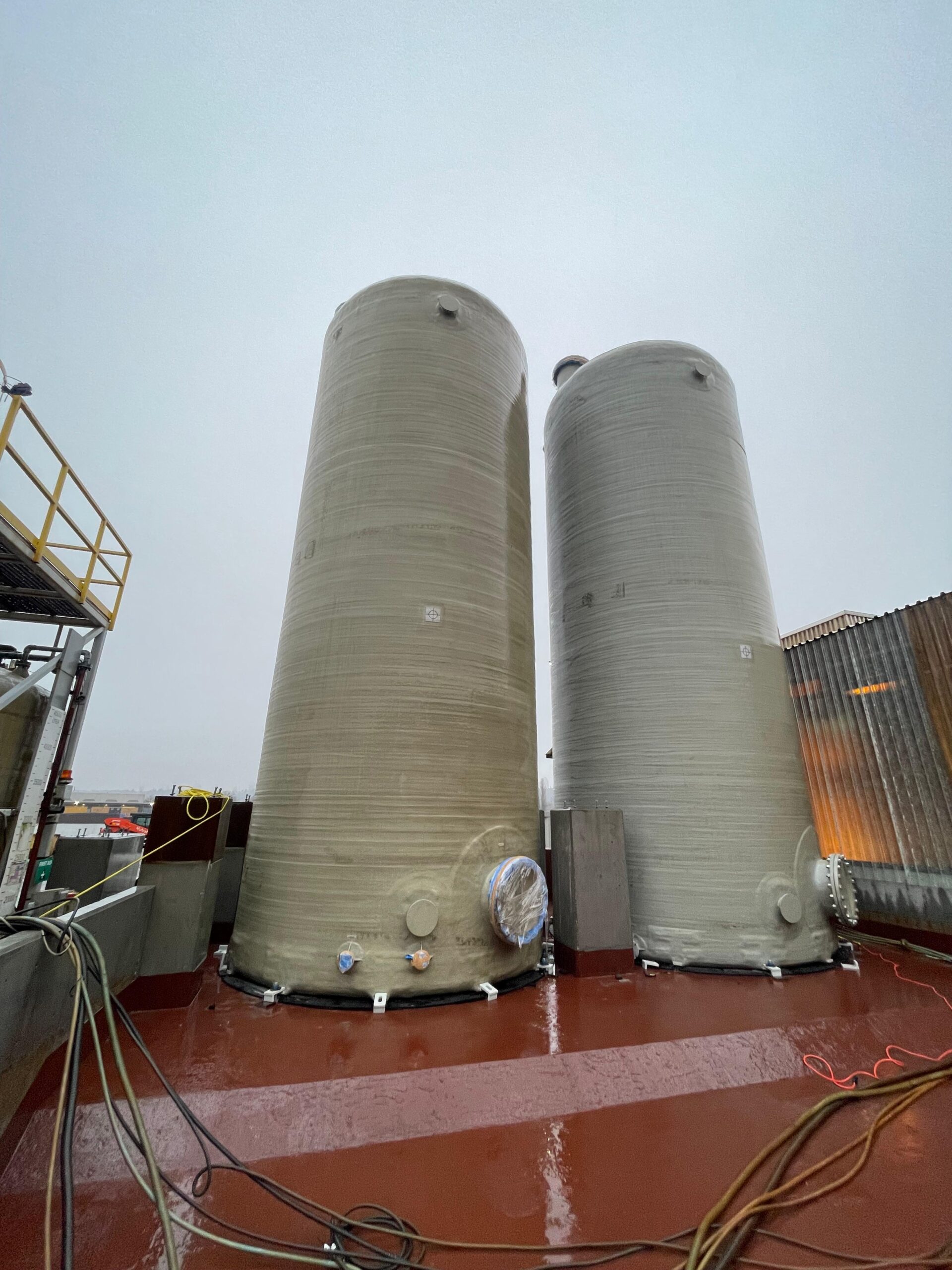 This project involved the structural design and seismic analysis of two FRP chemical storage tanks for HCL and ferrous chloride. We engineered a robust support system to safely resist gravity and lateral loads, ensuring long-term stability and performance. The tanks were full designed in accordance with the ASME RTP‐1 standard, the industry’s leading code for reinforced thermoset plastic corrosion‐resistant equipment. By meeting RTP‐1 requirements for materials, fabrication, quality control, and testing, we delivered a high‐reliability solution for demanding chemical environments.